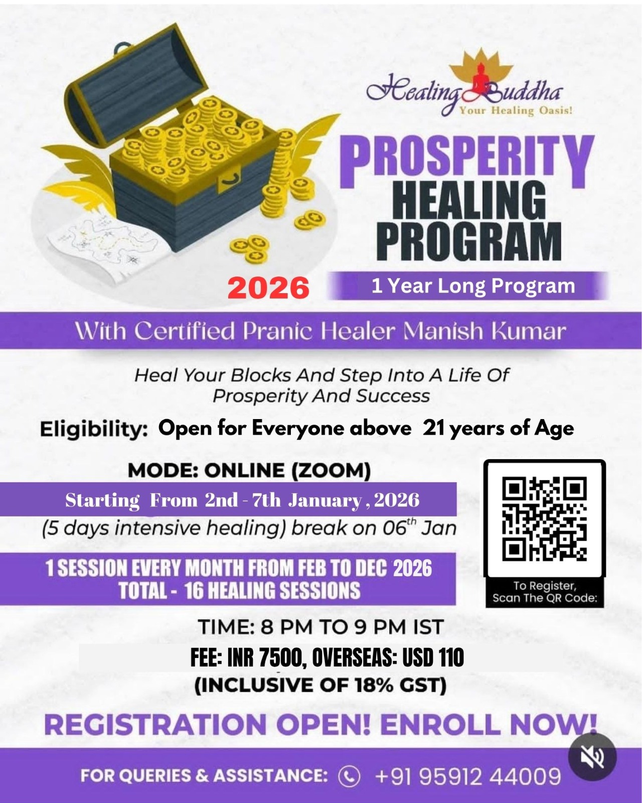 Harness and materialize the prosperity energy at the beginning of the New Year and compound the energies through out the year with special sessions every month to bring abundance and luck to your life. Enroll in this program to heal your blocks and step into a life of prosperity and success. The program encompasses five days of intensive healing sessions in January followed by one intensive healing session each month till December 2026).